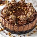- Step 18: Pipe the whipped cream around the cheesecake’s edges, drizzle remaining ganache over the top, and decorate with Ferrero Rocher candies if desired.