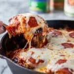 This One Pan Pizza Chicken recipe combines juicy chicken thighs with a flavorful tomato sauce, mushrooms, olives, pepperoni, and melted mozzarella cheese for an easy, delicious pizza-inspired meal baked all in one skillet.
