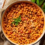 This easy, one-pot homemade Spaghetti-O’s recipe features Italian sausage simmered with tomatoes, garlic, and herbs, combined with tender Anellini pasta cooked directly in flavorful chicken broth. Ready in under 40 minutes, it’s a comforting, kid-friendly pasta dish with rich homemade tomato sauce and optional parmesan topping.