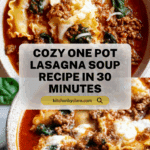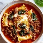 This One Pot Lasagna Soup offers all the comforting flavors of classic lasagna in a hearty, easy-to-make soup. Ground beef and Italian sausage are simmered with savory tomato sauce, herbs, and broken lasagna noodles in a rich broth, then finished with fresh spinach and a creamy ricotta-mozzarella topping. Perfect for a cozy weeknight dinner, this soup combines simplicity and depth of flavor in a single pot with minimal cleanup.