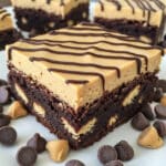 Delicious and rich Peanut Butter Brownie Bars featuring double chocolate brownies loaded with Reese’s peanut butter chips, topped with a thick layer of creamy peanut butter buttercream frosting, and optionally drizzled with melted semi-sweet chocolate for an extra indulgent touch.