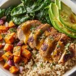 - Assemble Bowls: Divide the cooked brown rice evenly among serving bowls. Top each bowl with the roasted sweet potato and onion mixture, sliced chicken, thinly sliced avocado, and fresh baby spinach.