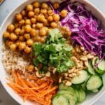 - Assemble Bowls: Divide cooked brown rice evenly among bowls. Top with the cabbage-cilantro mixture, sliced cucumbers, shredded carrot, and crispy chickpeas. Sprinkle chopped roasted peanuts and extra cilantro on top. Drizzle peanut sauce over the bowls. Serve with lime wedges on the side for squeezing.