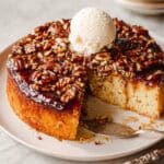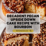 This Pecan Upside Down Cake features a rich, buttery pecan topping caramelized with brown sugar and dark Karo syrup beneath a moist, tender cake infused with bourbon and vanilla. The cake is baked to golden perfection and inverted to reveal a glossy, nutty pecan layer that’s perfect for festive occasions or a special dessert.