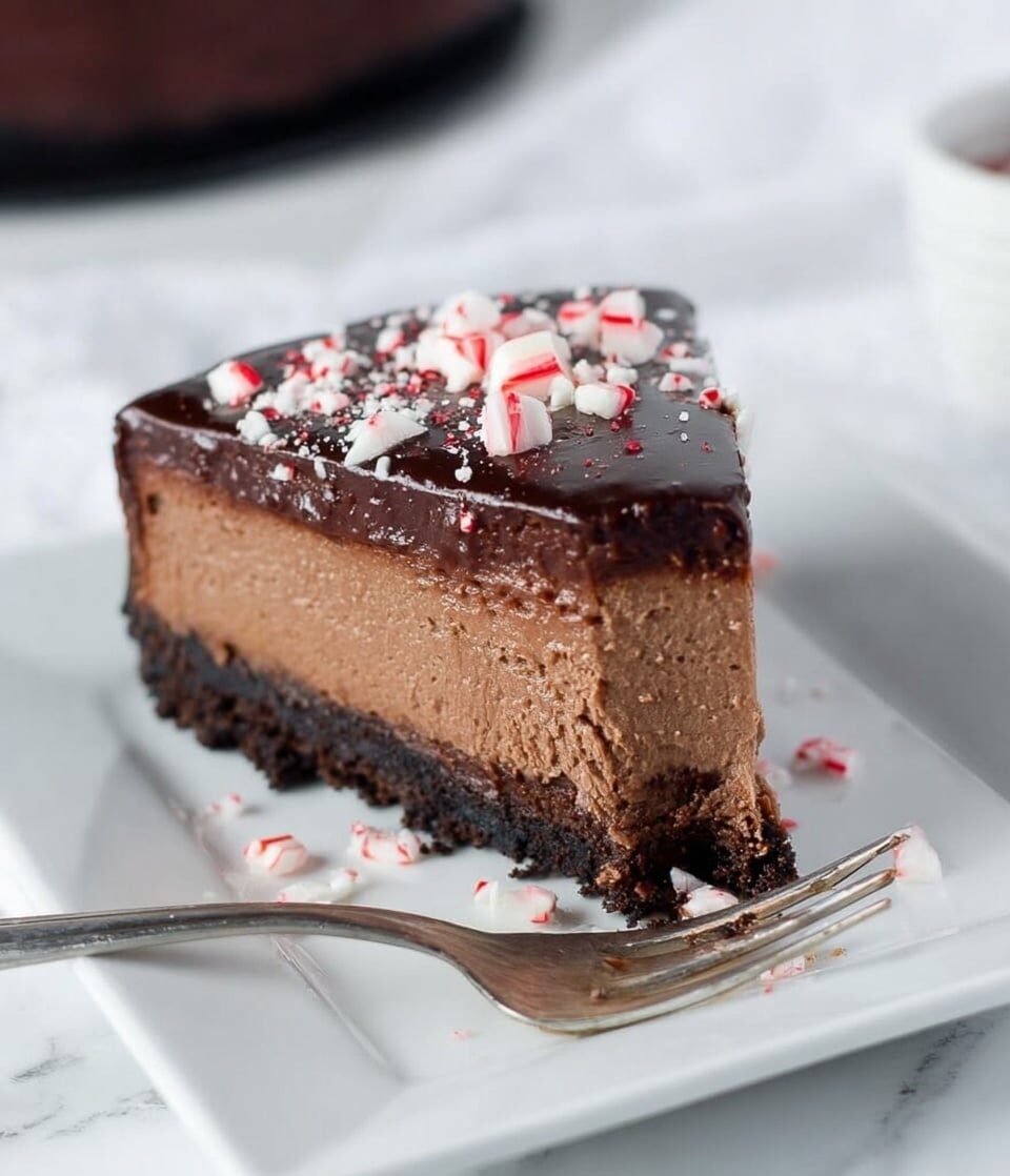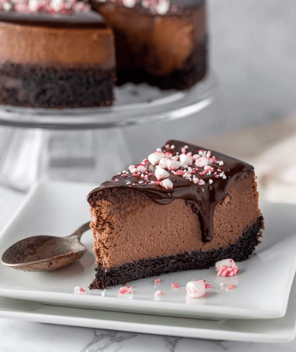 This Peppermint Chocolate Cheesecake is a rich and decadent dessert that combines the smoothness of cream cheese with the refreshing flavor of peppermint and the indulgence of chocolate. Featuring a crunchy Oreo crust and a creamy, luscious filling with hints of cocoa and peppermint extract, it’s topped with a glossy chocolate ganache and festive peppermint baking bits—perfect for holiday celebrations or a special treat.