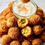 Crispy and savory Pimento Cheese Fried Olives are a delectable appetizer featuring pimento-stuffed olives filled with creamy pimento cheese, coated in a crispy panko-Parmesan crust, and fried to golden perfection. Paired with a flavorful garlic-pimento mayonnaise, this bite-sized treat offers a perfect balance of creamy, tangy, and crunchy flavors, ideal for entertaining or a special snack.