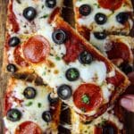 This easy-to-make Pizza Bread is a delicious and quick snack or appetizer featuring Italian bread loaded with pizza sauce, melted mozzarella and Parmesan cheese, pepperoni, and black olives. Perfect for satisfying pizza cravings without the wait, it combines classic pizza flavors on a crunchy toasted base.