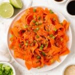 A fresh and vibrant Raw Carrot Salad featuring thin carrot ribbons tossed in a tangy and slightly sweet dressing made with sesame oil, rice wine vinegar, soy sauce, honey, and lime juice. Topped with toasted sesame seeds and chopped green onions, this salad is a perfect light, healthy side dish that can be enjoyed immediately or chilled to deepen the flavors.