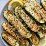Deliciously tender roasted zucchini spears seasoned with garlic, lemon, oregano, and topped with savory parmesan cheese. This easy-to-make side dish offers a perfect balance of fresh vegetable flavor and crispy, cheesy edges that make for a healthy and satisfying addition to any meal.