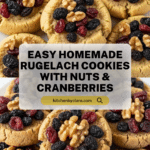 Delight in these classic homemade Rugelach Cookies, featuring a tender almond and einkorn flour dough filled with a sweet and nutty mixture of walnuts, raisins, and dried cranberries. These charming crescent-shaped treats are perfect for a cozy snack or festive gathering, baked to golden perfection with a delightful buttery flavor.
