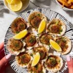 - Assemble and Broil Scallops: Place 12 small baking shells or mini oven-safe dishes on a baking sheet. Pipe a layer of the chorizo butter mixture on the bottom of each shell. Top with a few cubes of chopped scallop, then add another dollop of butter mixture on top. Place the baking sheet on the middle rack of the oven and broil on high for 6-8 minutes, or until the scallops are golden and cooked through.