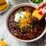 - Serve: Shred the beef directly in the slow cooker into tender chunks. Adjust salt to taste. Serve the chili hot topped with sour cream, shredded cheddar cheese, chopped green onions, and alongside chips or cornbread for a complete meal.