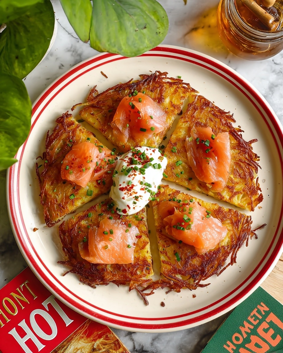 Keywords: rösti, smoked salmon, honey smoked salmon, crispy potato cake, breakfast, brunch, savory dish, honey drizzle, crème fraîche, chives, red pepper flakes