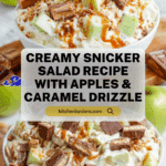 - Serve and Garnish: Before serving, drizzle the salad with caramel sauce if desired and top with the reserved apple and Snickers pieces for a decorative touch. Enjoy immediately.