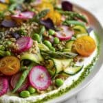 A vibrant and refreshing Spring Green Salad featuring tender baby greens, roasted heirloom tomatoes, asparagus, zucchini ribbons, peas, farro, and radishes, all brought together with a zesty lemon herb dressing and creamy whipped honey ricotta. This light yet satisfying salad is perfect for springtime meals or as a colorful side dish.
