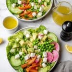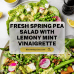 A fresh and vibrant Spring Pea Salad featuring crisp gem lettuce, radishes, cucumbers, snap peas, English peas, avocado, and carrot, all topped with creamy feta, crunchy pistachios, and fragrant fresh mint and basil. Tossed in a tangy and refreshing lemony mint vinaigrette, this salad is perfect for a light lunch or as a springtime side dish.