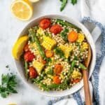 A vibrant and refreshing Spring Veggie Couscous Salad combining roasted heirloom tomatoes, tender asparagus, sweet roasted corn, and crisp cucumber, all tossed with pearl couscous and a zesty lemon-garlic dressing. Perfect as a light lunch or a colorful side dish.