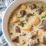 This comforting Steak and Potato Soup features tender cubes of beef simmered with diced russet potatoes, aromatic herbs, and onions in a rich beef broth, finished with creamy heavy cream for a luscious texture. Slow-cooked to perfection, this hearty soup is perfect for warming up on chilly days.