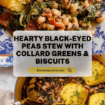 This hearty Stewed Black-Eyed Peas with Collard Greens & Cornbread Biscuits recipe features tender smoked meat simmered with black-eyed peas and flavorful collard greens in a richly seasoned broth. Topped with fluffy Cajun-spiced cornbread drop biscuits, this comforting one-pot Southern-inspired stew is perfect for a cozy meal. The combination of smoky ham or turkey, aromatic vegetables, and fresh herbs makes this dish both soulful and delicious.