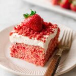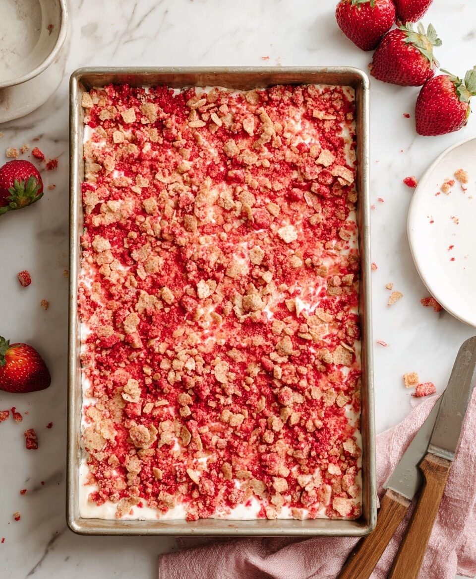 Strawberry Crunch Cake is a delightful treat that combines a light, fluffy strawberry-flavored cake with a rich buttercream frosting and a crunchy, sweet topping. This easy-to-make dessert is perfect for gatherings or a special homemade indulgence.