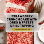 Delight in this Strawberry Crunch Cake featuring a moist, fluffy strawberry-flavored base layered with creamy buttercream frosting and topped with a crunchy mixture of golden Oreos and freeze-dried strawberries for the perfect combination of textures and flavors.