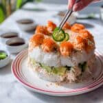 Keywords: sushi cake, sushi bundt cake, Japanese sushi recipe, crab tampico, spicy salmon sushi, layered sushi, creative sushi presentation