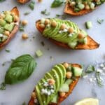 A fresh and wholesome Sweet Potato Avocado Toast topped with a vibrant Lemon Basil Chickpea Salad. This nutritious recipe features baked sweet potato slices as a gluten-free alternative to bread, layered with creamy avocado and a zesty chickpea salad enhanced by lemon, fresh basil, and feta cheese. Perfect for a light lunch or healthy snack.