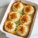 - Add Cheese and Continue Baking: Remove the foil and sprinkle the cheese mixture evenly over the onions. Return the dish to the oven and bake for an additional 5 to 7 minutes until the cheese has melted and is bubbling around the edges.