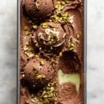 A rich and decadent Dubai-inspired chocolate ice cream featuring a silky chocolate base layered with toasted kataifi, pistachio butter, and tahini cream, creating a unique and indulgent dessert experience.