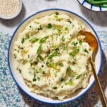 - Garnish and Serve: Transfer the mashed potatoes to a serving dish and garnish with the reserved green onions and a sprinkle of toasted sesame seeds for added crunch and flavor. Serve warm.