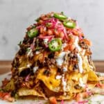 Trash Can Nachos is a fun and indulgent layered nacho recipe featuring seasoned ground beef, black beans, creamy queso blanco, and melted cheddar cheese, all stacked in a unique tall presentation and baked to perfection. Topped with sour cream, BBQ sauce, fresh jalapeños, pico de gallo, and pickled onions, this dish is perfect for parties or game days.
