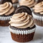 Indulge in these decadent Triple Oreo Chocolate Cupcakes featuring super moist cocoa-infused cake layered with a whole Oreo at the base, topped with creamy marshmallow Oreo frosting and finished with a full Oreo cookie. Perfect for Oreo lovers craving an ultimate chocolate treat with a delightful crispy surprise.