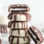 Delightfully sweet and easy-to-make White Chocolate Covered Oreos feature classic Oreo cookies dipped in smooth white vanilla melting wafers, then elegantly drizzled with rich dark chocolate. Perfect for parties, gifts, or an indulgent treat!